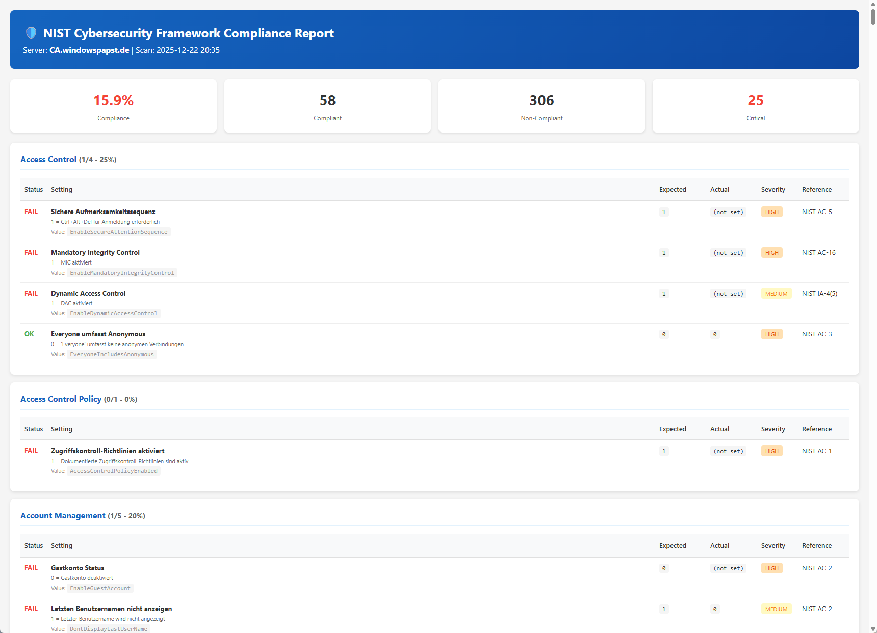 Active Directory ist das Herzstück jeder Windows-Infrastruktur – und gleichzeitig ein beliebtes Angriffsziel. Veraltete Konten, schwache Passwortrichtlinien, unsichere Kerberos-Delegierungen oder fehlende LAPS-Deployments bleiben oft unentdeckt, bis es zu spät ist. Compliance-Anforderungen wie BSI IT-Grundschutz oder NIST Cybersecurity Framework manuell zu prüfen, kostet Tage – wenn nicht Wochen.