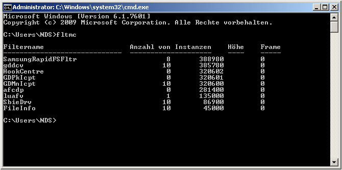 Probleme mit Filtertreibern – Welche sind aktuell eigentlich geladen? 18. September 2014 Jörn Walter Allgemein Um Probleme mit Zusammenhang mit Filtertreibern zu ermitteln, muss man erst einmal wissen welche geladen sind. Das finden wir mit folgendem Befehl heraus. Wir öffnen die CMD über Start> Ausführen und starten folgenden Befehl: fltmc