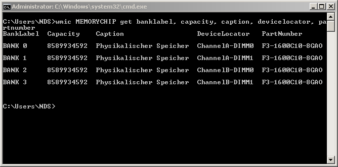 Per WMI den Physikalischen Speicher abfragen 20. September 2014 Jörn Walter AllgemeinPhysikalischen Speicher abfragenMit einer kleinen Befehlszeile können wir uns nützliche Informationen über unseren RAM ausgeben lassen.Bank, Kapazität, Typ usw.wmic MEMORYCHIP get banklabel, capacity, caption, devicelocator, partnumber