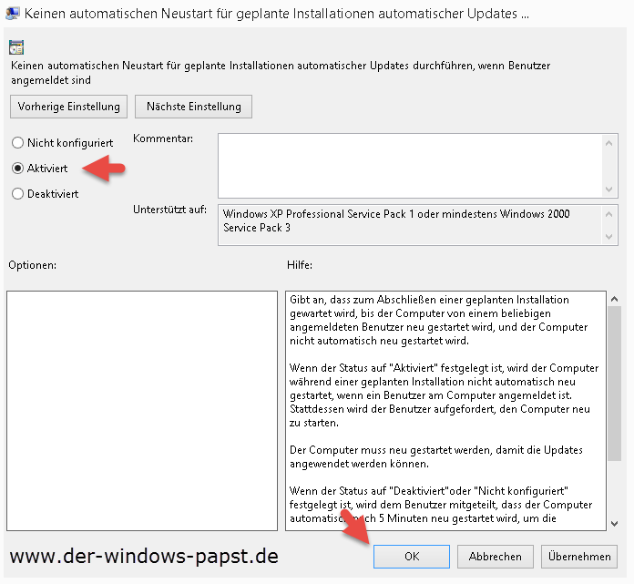 Keinen automatischen Neustart für geplante Installationen automatischer Updates 29. November 2014 Jörn Walter Windows 8 So deaktivieren Sie den automatischen Neustart für geplante Installationen automatischer Updates. Gruppenrichtlinieneditor öffnen und zum Pfad Computerkonfiguration>Administrative Vorlagen>Windows-Komponenten>Windows Update navigieren.