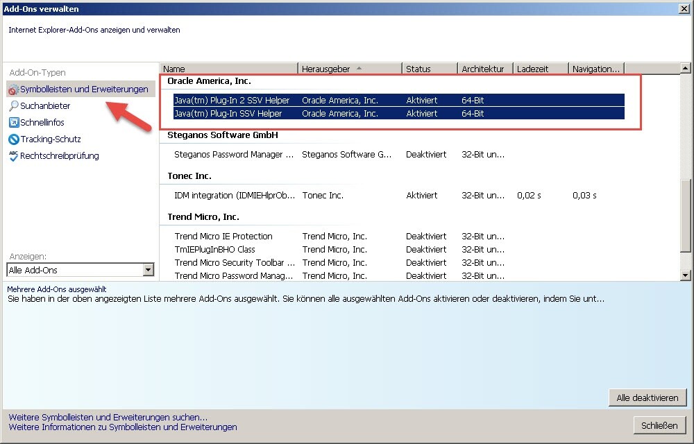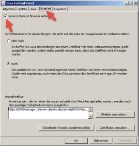 Es wird empfohlen die >Java Unterstützung im Browser vorerst abzuschalten.