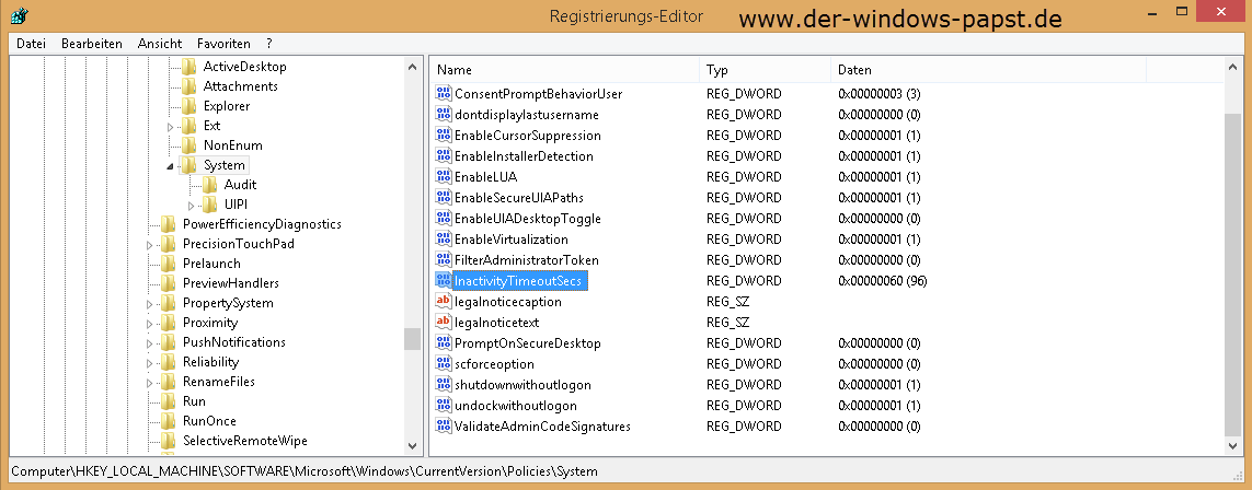 Mit diesem Registry-Key setzen wir einen festen Wert in Sekunden, ab wann der Computer den Bildschirm sperrt, egal welche Einstellung im Bildschirmschoner hinterlegt ist.