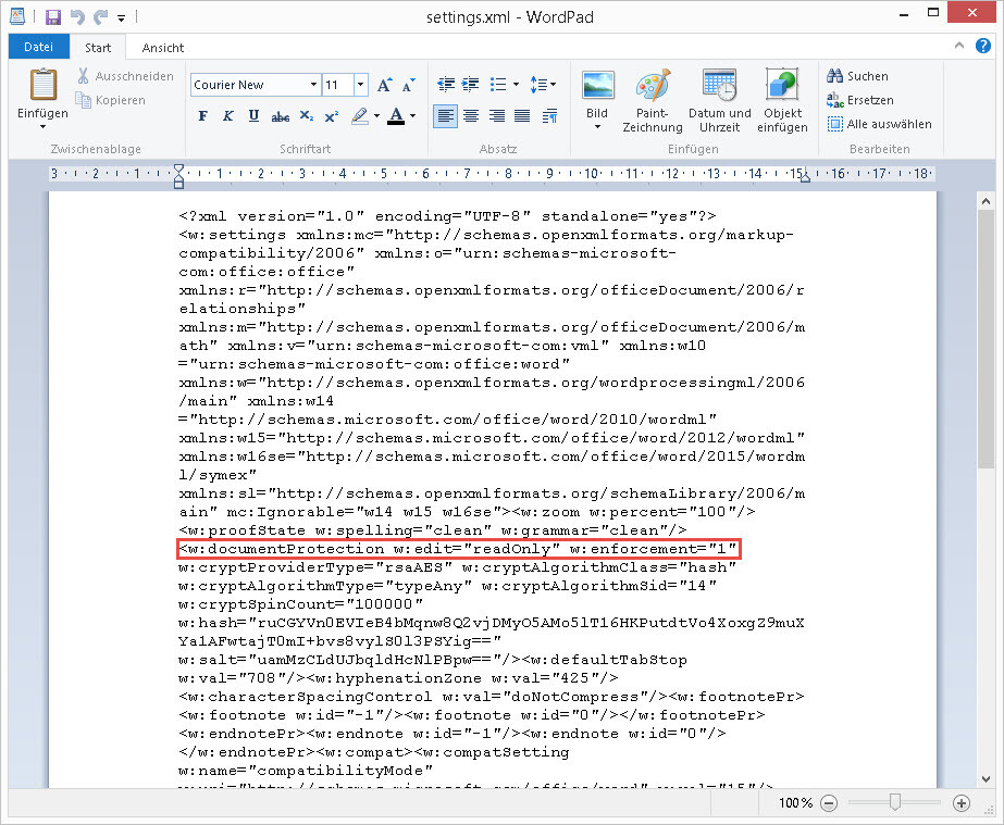 Bei Excel navigieren wir nach XL > Worksheets > Setting.xml und entfernen dort die Zeile > Sheet Protection
