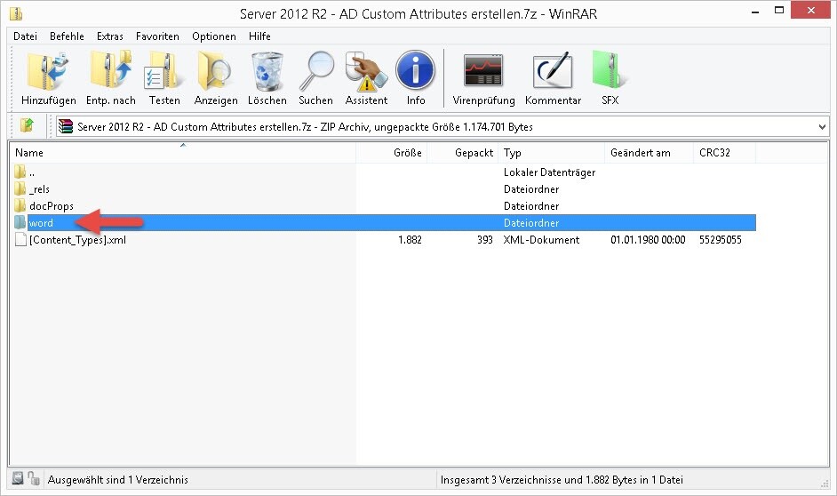 Das umbenannte Dokument mit WinRar öffnen und zu dem Ordner Word navigieren und Doppelklick: