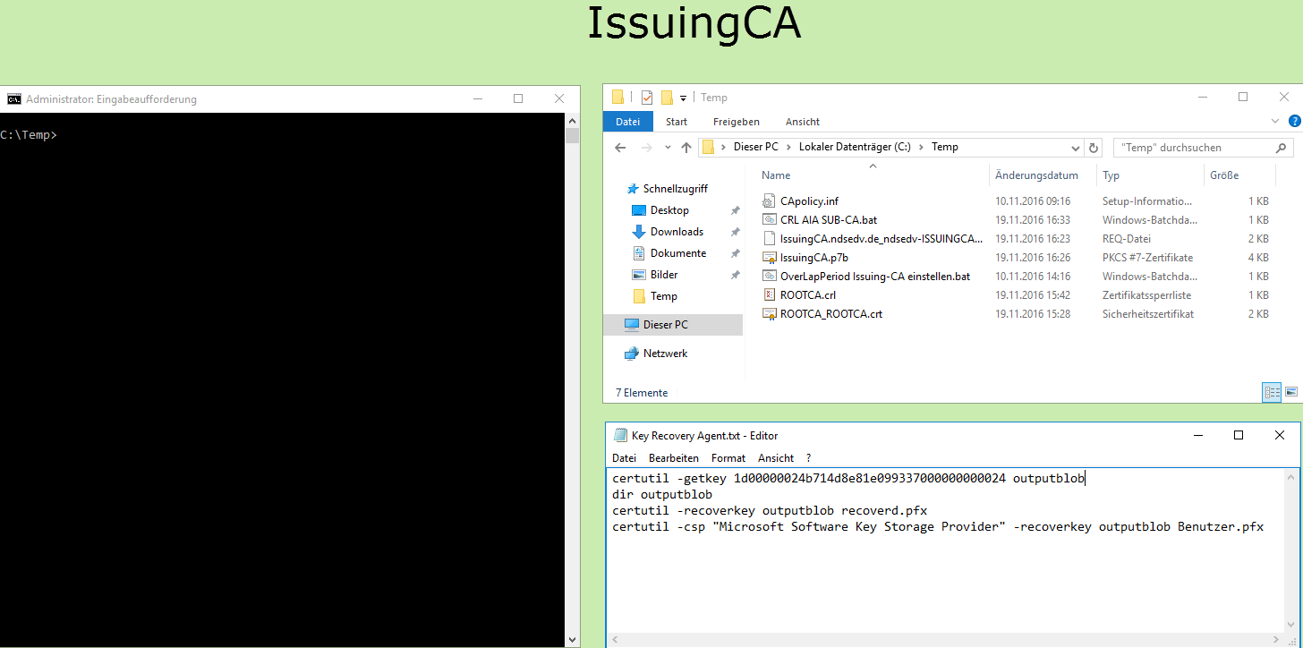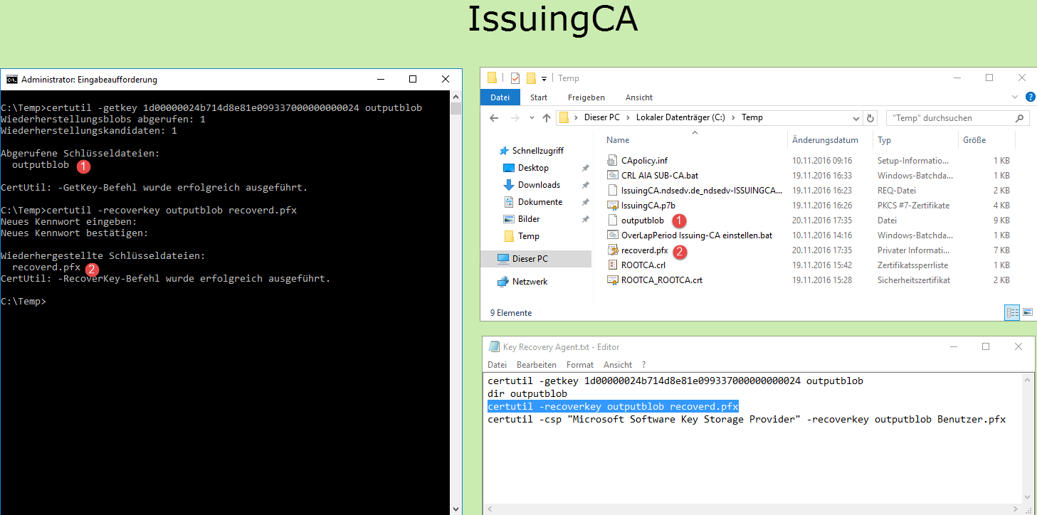 Gehen wir davon aus, das bereits Zertifikate ausgestellt und gesichert wurden. Dann starten wir jetzt mit einer Schlüsselwiederherstellung.