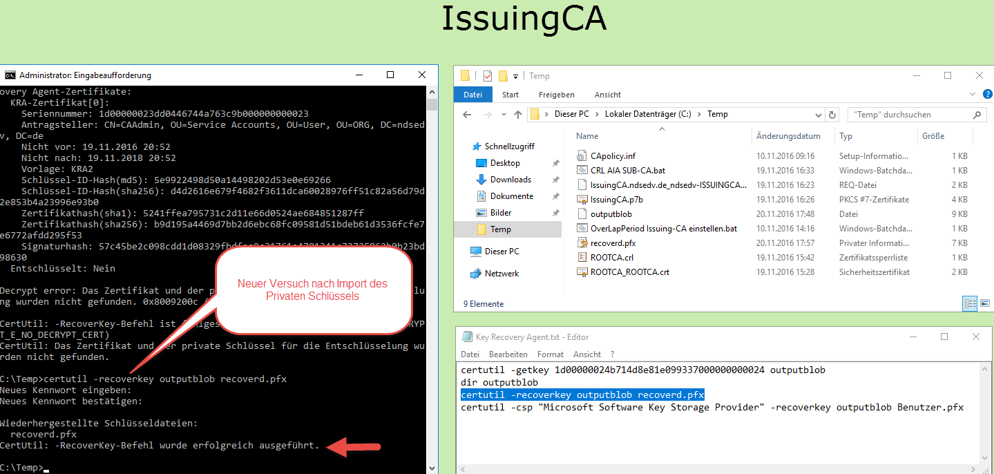 Dieser Fehler tritt ein, wenn der Schlüssel zur Wiederherstellung nicht im Benutzer Speicher hinterlegt ist, mit dem das wiederherzustellende Zertifikat abgelegt wurde.