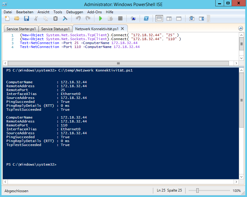 Mit diesem Skript prüfen wir die Netzwerk Konnektivität auf Port 25 und 110.