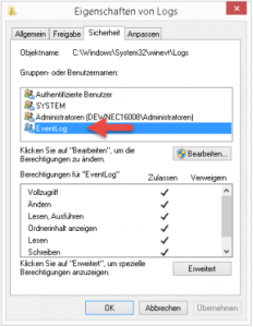 Gruppe aus dem Ordner %SystemRoot%\System32\winevt\logs entfernt wurde oder die ACL unklar ist.