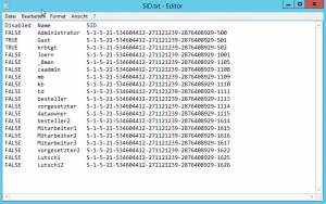 CMD – Alle SIDs der Benutzer aus dem Active Directory exportieren 2. März 2017 Jörn Walter SkripteAlle SIDs der Benutzer aus dem Active Directory exportierenwmic useraccount get name,sid,disabled >SID.txt