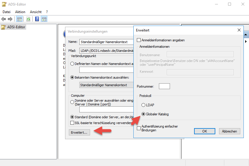 Active Directory – Informationen aus dem Global Catalog einsehen 8. April 2017 Jörn Walter Windows Server 2016Zwecks Überprüfung ob die Replikation tatsächlich funktioniert ist die Einsicht in den Global Catalog (GC) notwendig.ADSI Edit öffnen > Verbindung herstellen > Standardmäßiger Namenskontext > Erweitert > Globaler Katalog