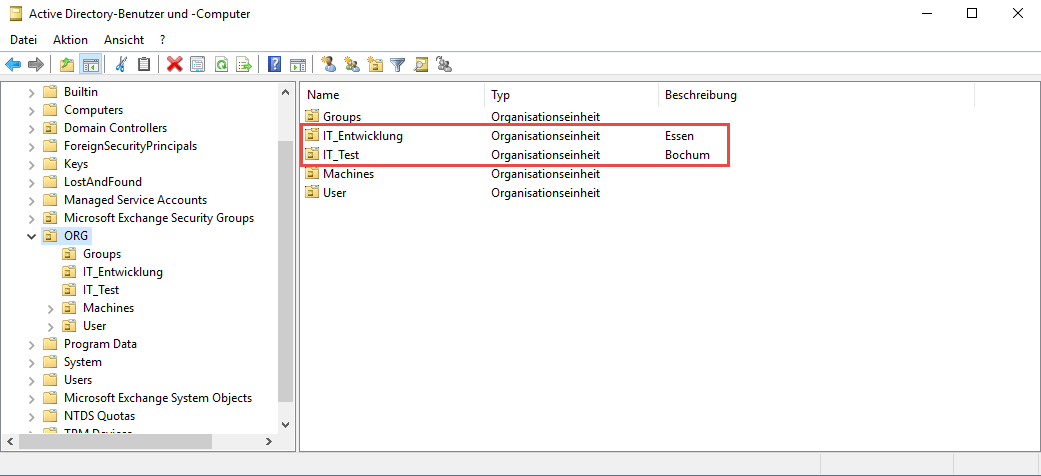 # Erstelle mehrere OUs names IT_Entwicklung und IT_Test unterhalb von Abteilungen mit Beschreibung