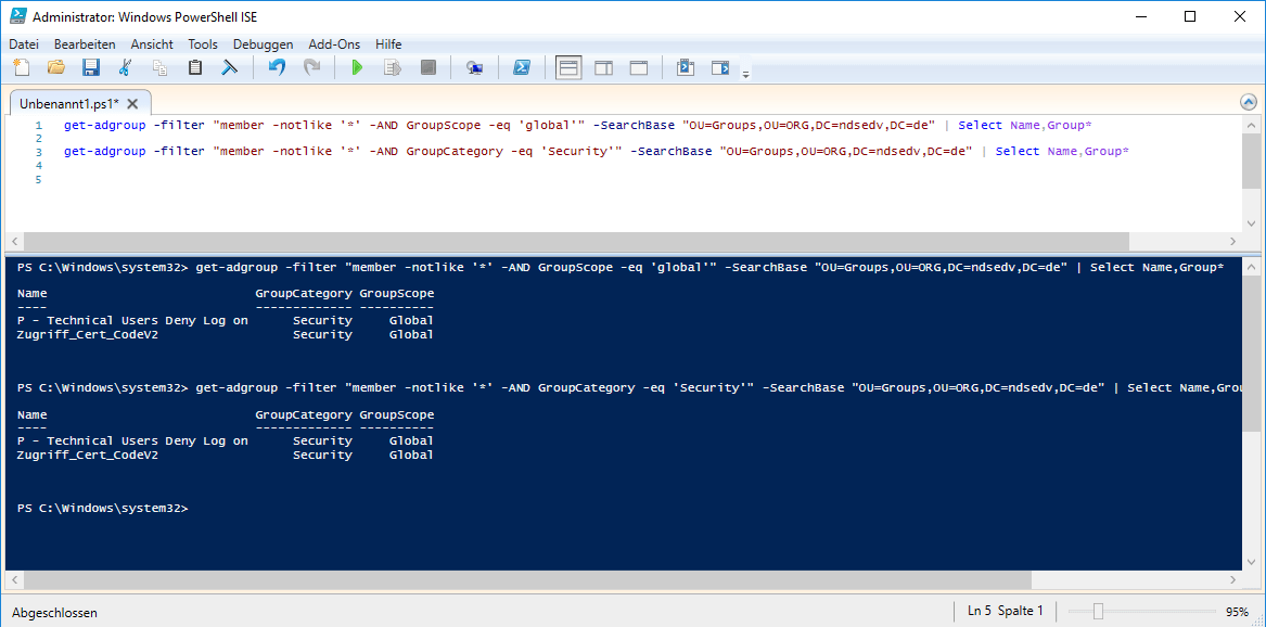 get-adgroup -filter "member -notlike '*' -AND GroupScope -eq 'global'" -SearchBase "OU=Groups,OU=ORG,DC=ndsedv,DC=de" | Select Name,Group* get-adgroup -filter "member -notlike '*' -AND GroupCategory -eq 'Security'" -SearchBase "OU=Groups,OU=ORG,DC=ndsedv,DC=de" | Select Name,Group*
