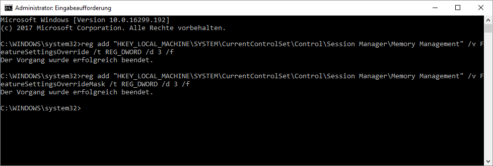 reg add “HKEY_LOCAL_MACHINE\SYSTEM\CurrentControlSet\Control\Session Manager\Memory Management” /v FeatureSettingsOverride /t REG_DWORD /d 3 /f