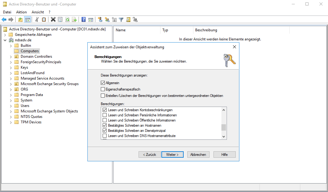 Damit ein (technisches) Konto, Computer in die Domäne heben kann werden nicht viele Rechte benötigt. Über die Zuweisung bzw. Delegierung von Rechten ist dies in wenigen Schritten zu realisieren.