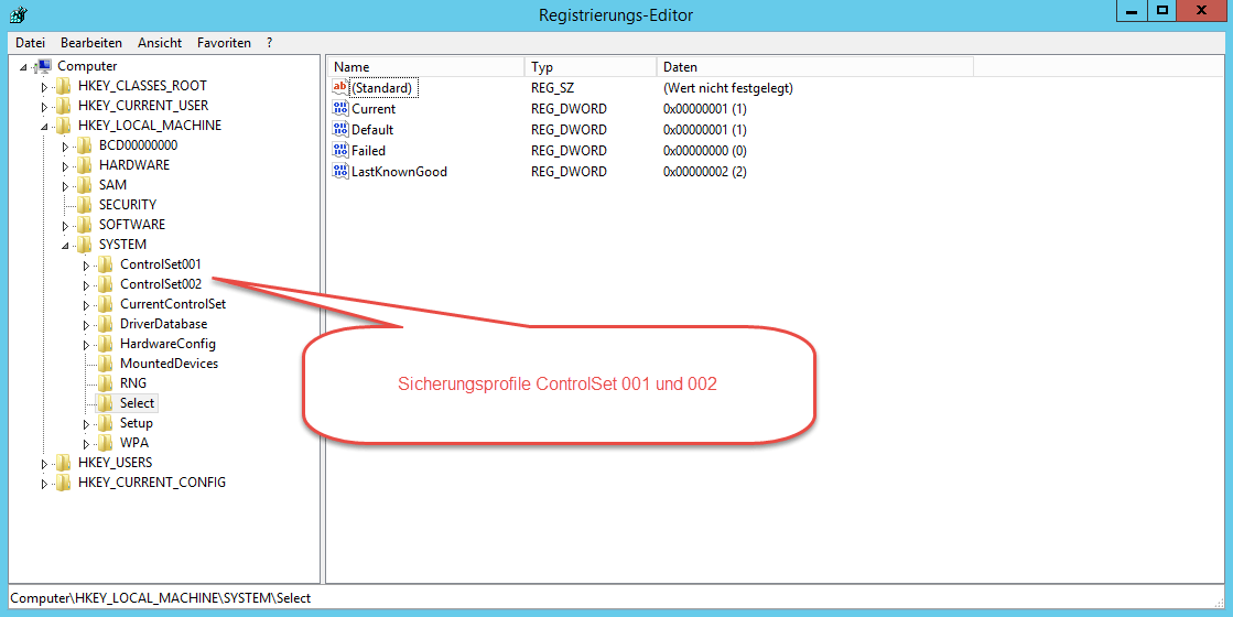 Hier sehen wir die beiden Kopien ControlSet001 und ControlSet002. Die Sets werden im Bedarfsfall fortlaufend nummeriert. Bei Fehlern werden Sets gelöscht und fortlaufend neu angelegt.