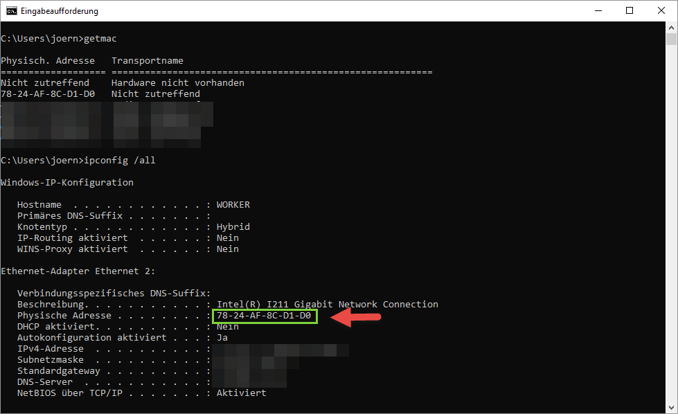 Starten die CMD mit administrativen und Rechten und setzen zur Ermittlung der MAC Adresse folgenden Befehl ab: