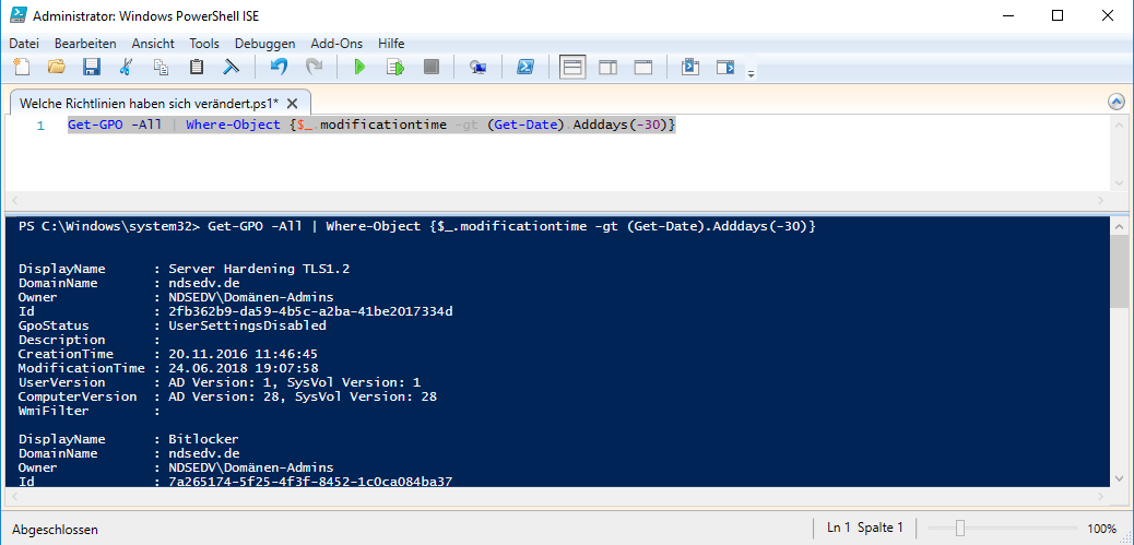 Alle Gruppenrichtlinien anzeigen die in den letzten 30 Tagen verändert wurden 1. Juli 2018 Jörn Walter Skripte Welche GPO wurde verändert? Get-GPO -All | Where-Object {$_.modificationtime -gt (Get-Date).Adddays(-30)} oder nicht verändert wurden Get-GPO -All | Where-Object {$_.modificationtime -lt (Get-Date).Adddays(-30)}