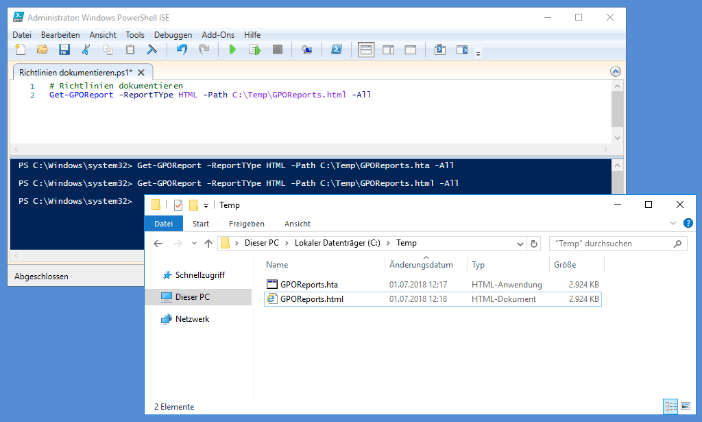 Diese Befehle erstellen jeweils einen einzelnen Bericht über alle Gruppenrichtlinien: