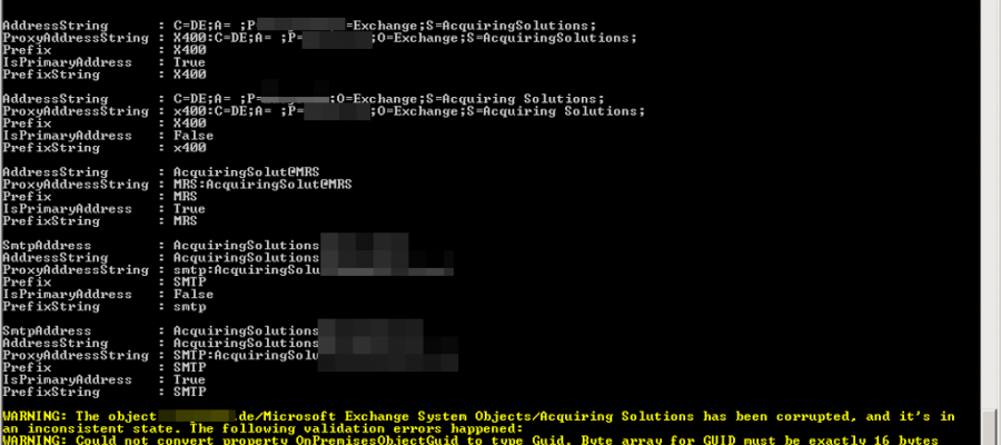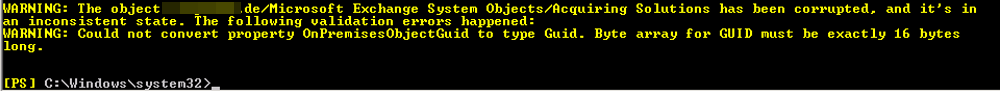 WARNING: The object ndsedv.de/Microsoft Exchange System Objects/Acquiring Solutions has been corrupted, and it’s in an inconsistent state. The following validation errors happened:WARNING: Could not convert property OnPremisesObjectGuid to type Guid. Byte array for GUID must be exactly 16 bytes Long.
