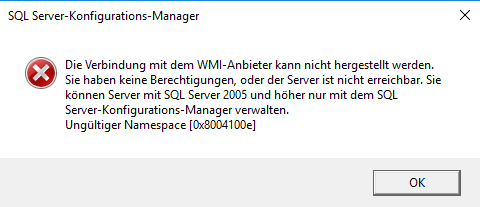 Die Verbindung mit dem WMI-Anbieter kann nicht hergestellt werden. Sie haben keine Berechtigung, oder der Server ist nicht erreichbar. Sie können Server mit SQL Server 2005 und höher nur mit dem SQL Server-Konfigurations-Manager verwalten. Ungültiger Namespace [0x8004100e]