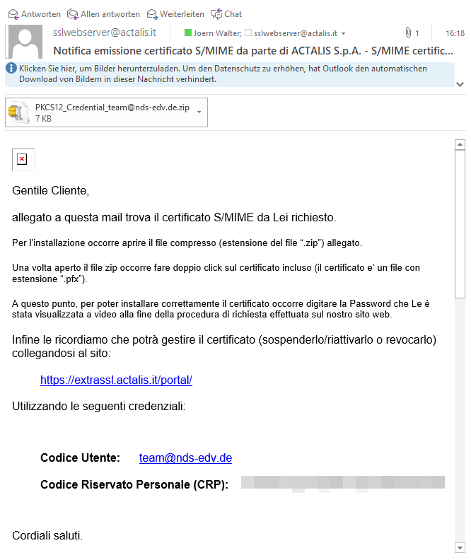 Auf der Webseite der Firma Actalis bekommt ihr kostenlos ein S/MIME Zertifikat ausgestellt. Die Gültigkeit beträgt immer nur 1 Jahr. Das Zertifikat kann nicht verlängert werden, es muss neu beantragt werden.