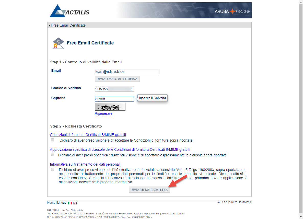 Es folgt eine E-Mail mit einem Verifizierungscode. Dieser wird in das 2. Feld eingetragen, Captcha abtippen, die Geschäftsbedingungen akzeptieren und absenden.