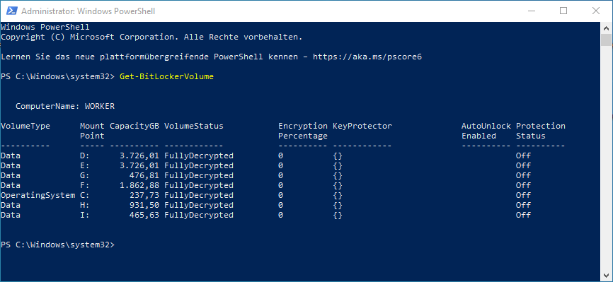 Um Bitlocker zu deaktivieren führen wir diesen Befehl mit administrativen Rechten in der Powershell aus.