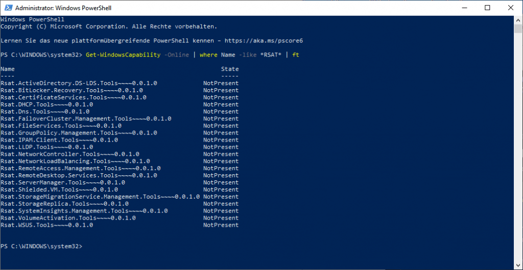 Get-WindowsCapability -Online | where Name -like *RSAT* | ft