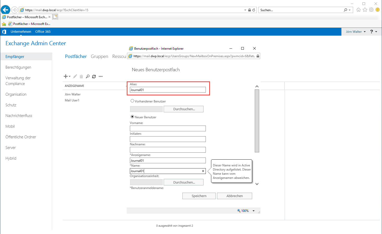 Zuerst erstellen wir ein Postfach, ich nenne es Journal01 (für nicht zustellbare Journalberichte).