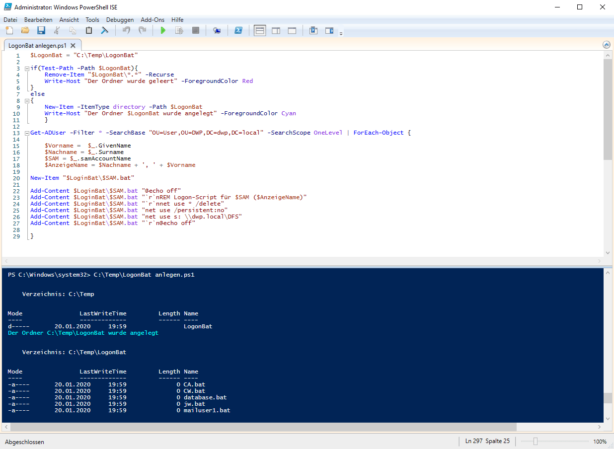 Mit diesem Skript erstellen wir automatisch für alle Benutzer einer OU die Logon Skripte. Danach müssen diese nur noch nach \\dwp.local\netlogon\ kopiert werden.