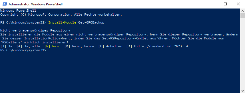 Das Skript kann mittels der Powershell und diesem Befehl aus der Repository installiert werden.