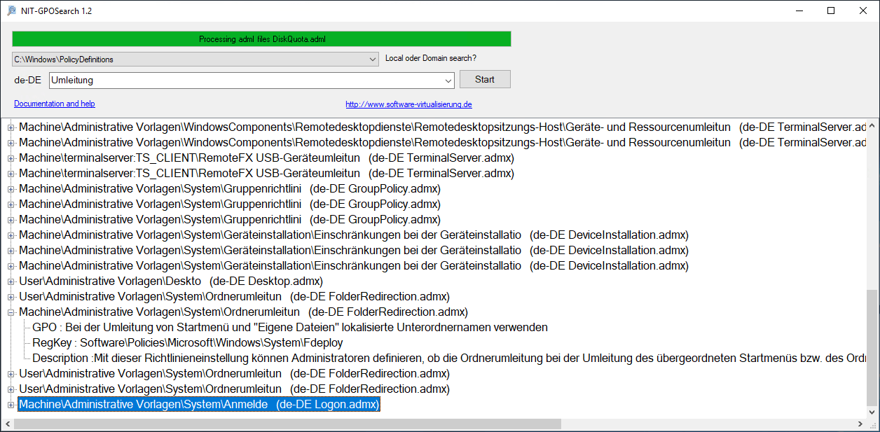Mit dem Tool NIT-GPOSearch kann man in den Gruppenrichtlinien-Vorlagen ob lokal oder im Netzwerk, nach bestimmten Einstellungen suchen.