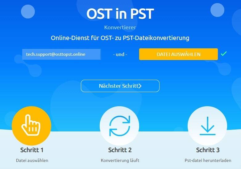Wie die Überschrift schon verrät, bietet der Online-Dienst OST to PST, eine weitere Möglichkeit der Konvertierung an. In 3 Schritten soll die Konvertierung abgeschlossen sein.