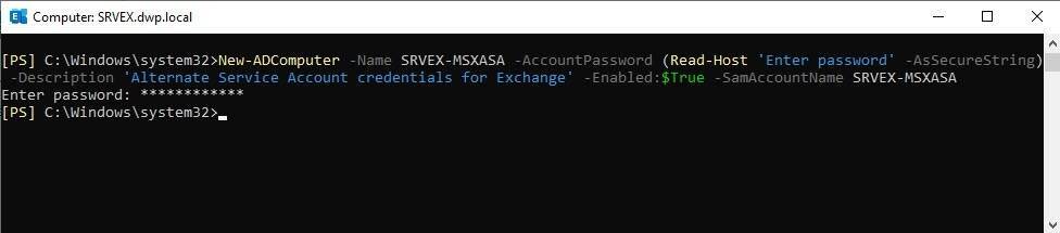 New-ADComputer -Name SRVEX-MSXASA -AccountPassword (Read-Host ‘Enter password’ -AsSecureString) -Description ‘Alternate Service Account credentials for Exchange’ -Enabled:$True -SamAccountName SRVEX-MSXASA