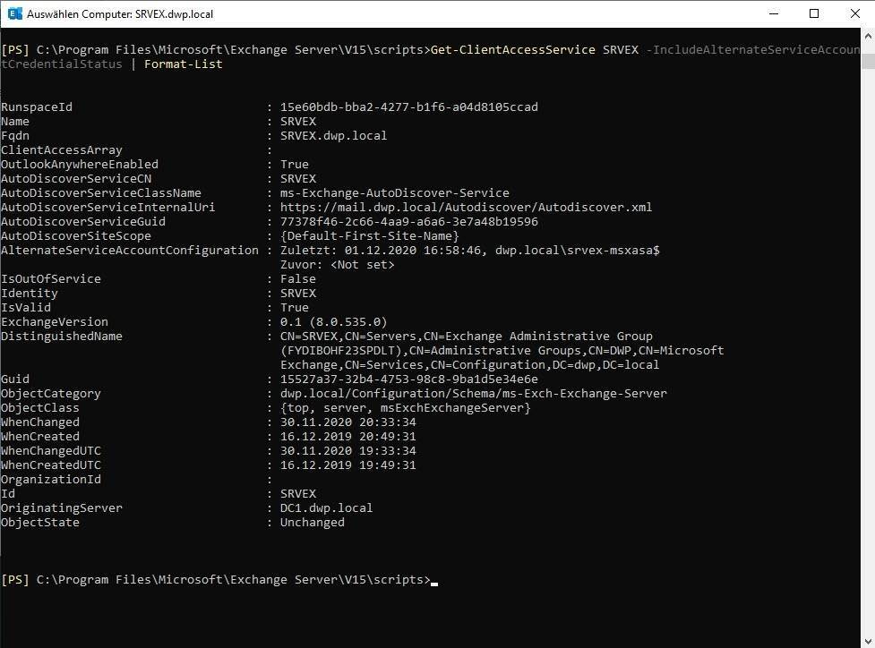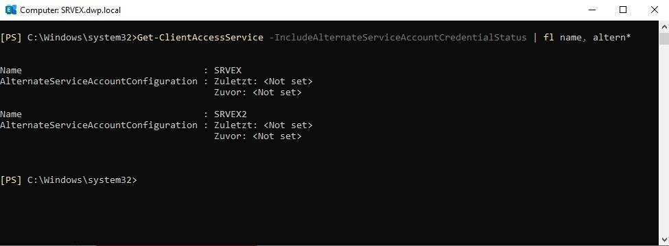 Get-ClientAccessService SRVEX -IncludeAlternateServiceAccountCredentialStatus | Format-List