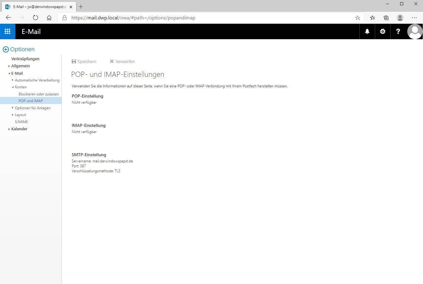 Nach der Aktivierung kann man die gesetzten SMTP Einstellungen in OWA direkt sehen.