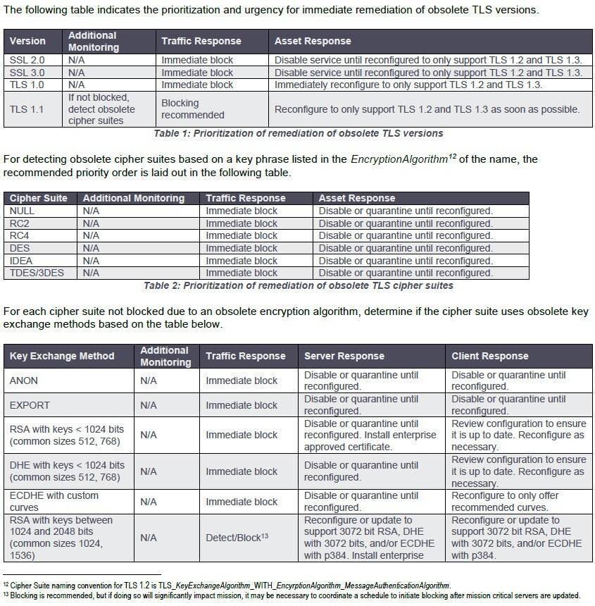 Es geht im Detail um veraltete TLS Versionen, Cipher Suites und Key-Exchange Mechanismen. Zugleich werden auf die Empfehlungen von CNSS (Committee on National Security Systems) und NIST (National Institute of Standards and Technology) hingewiesen.