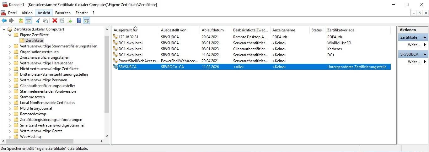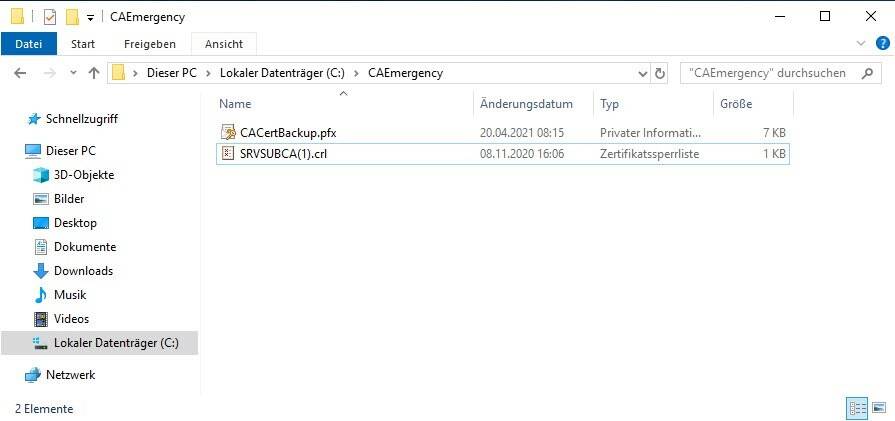 Dazu benötigen wir eine aktuelle Sperrliste und das Backup des Zertifizierungsstellenzertifikat. Diese beiden Teile lege ich in den Ordner C:\CAEmergency ab.