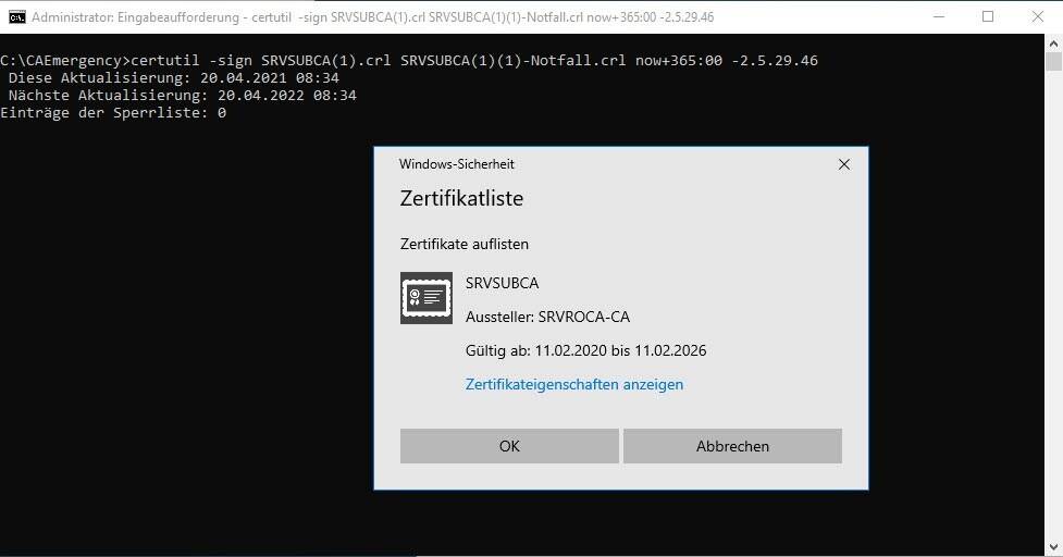 Erstellen wir nun die Notfallsperrliste. Dazu öffnen wir die CMD mit administrativen Rechten und setzen folgenden Befehl ab. Der Befehl erstellt auf Basis der aktuell vorliegenden Sperrliste eine neue und verändert das Ablaufdatum wie gewünscht. In diesem Beispiel exemplarisch um 365 Tage und 0 Stunden von heute an.