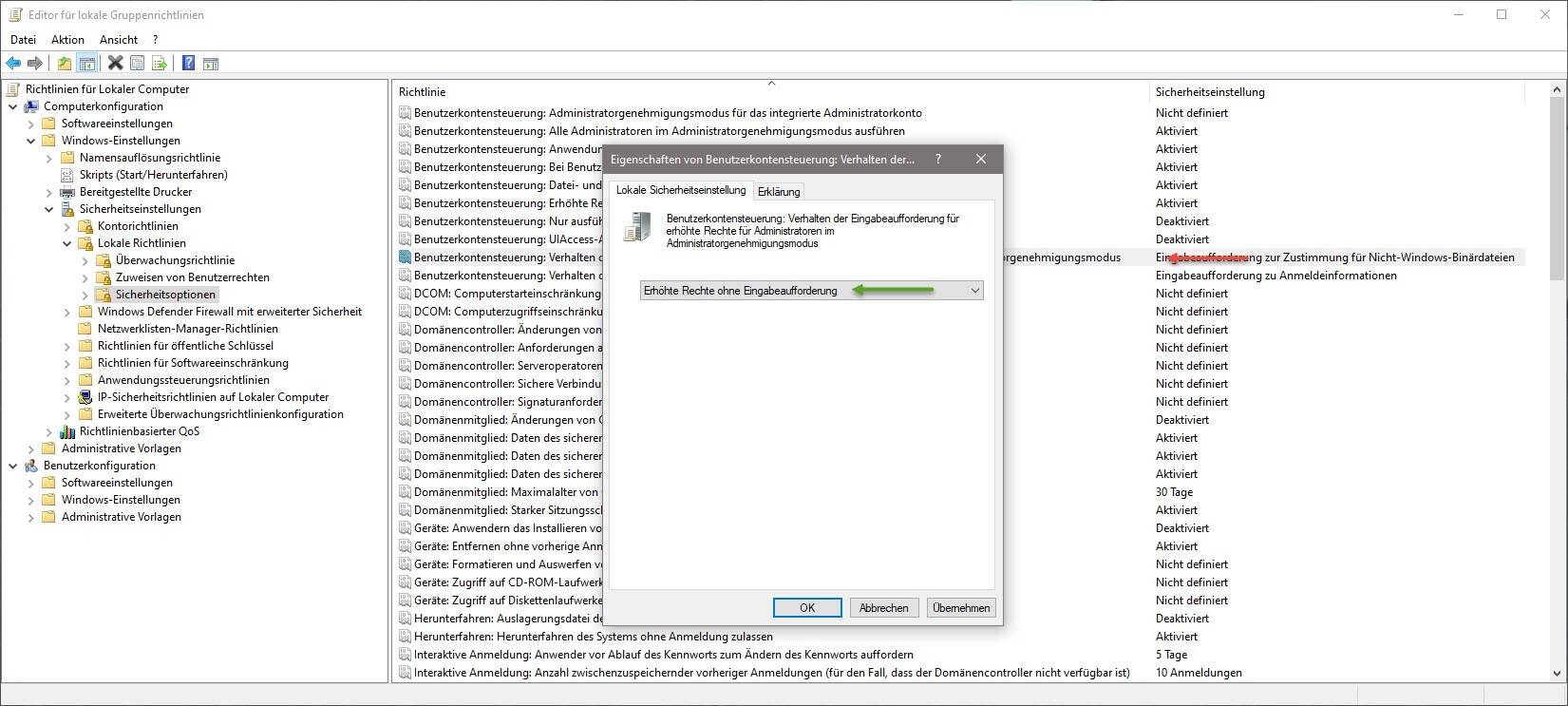 Diese Variante ist nicht empfehlenswert, weil diese dauerhaft umgesetzt bleibt. Die UAC sollte nicht auf Dauer umgangen werden!