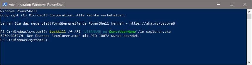 taskkill /f /FI “USERNAME eq $env:UserName”/im explorer.exe