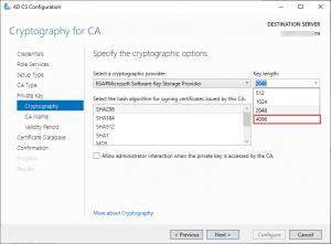Install-AdcsCertificationAuthority -CAType EnterpriseRootCa -CryptoProviderName “#Microsoft Software Key Storage Provider” -KeyLength 16384 -HashAlgorithmName SHA256