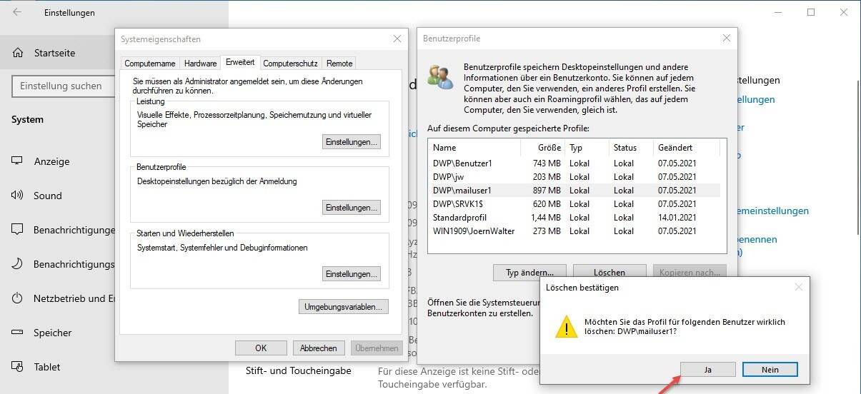 Durch das Löschen des Profils werden die Benutzer- Profildaten auf der Festplatte und in der Registrierung entfernt.