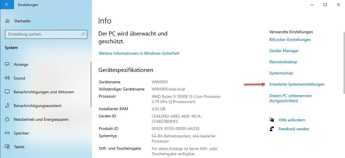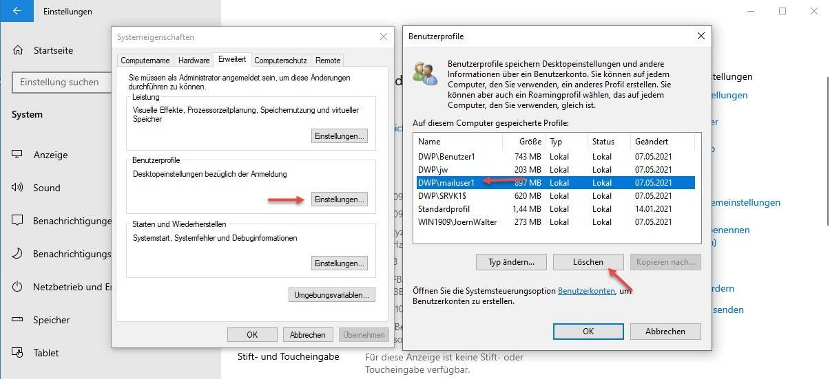 Über die erweiterten Systemeinstellungen gelangen wir zu den Systemeigenschaften und Benutzerprofilen.