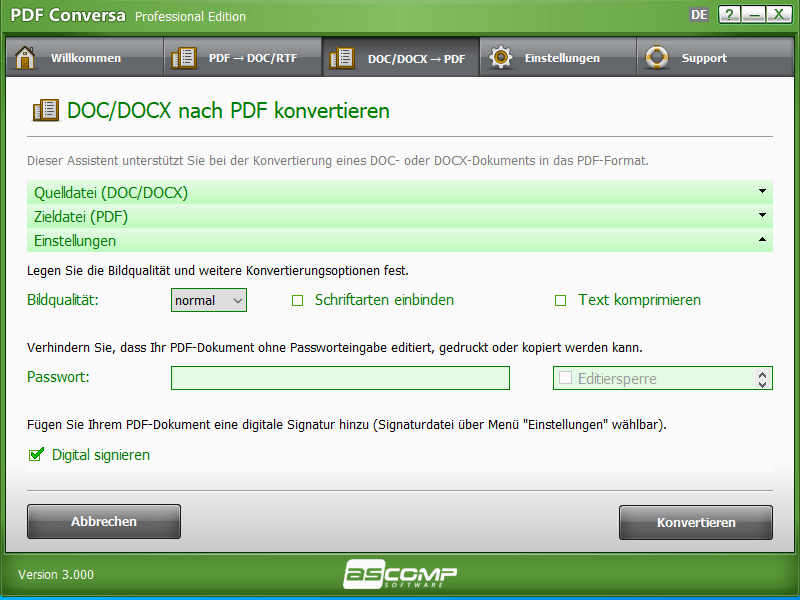 DOC/DOCX nach PDF: Auf Wunsch versehen Sie Ihre Word-Dokumente bei der Konvertierung in das PDF-Format mit einem Passwort, binden besondere Schriftarten direkt in die PDF-Datei ein, komprimieren Texte und legen die Bildqualität der enthaltenen Grafiken fest.