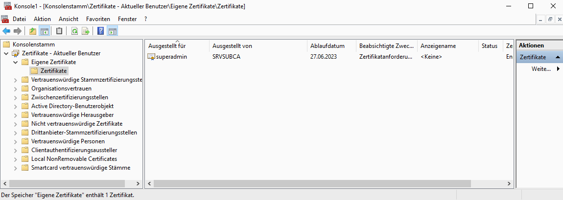 Wer über die MMC aus Versehen ein Zertifikat gelöscht hat, der kann das gelöschte Zertifikat mithilfe eines Administrators wiederherstellen. Der Private-Key (Maschinenschlüssel) bleibt nach der versehentlichen Löschung des Zertifikats erhalten.