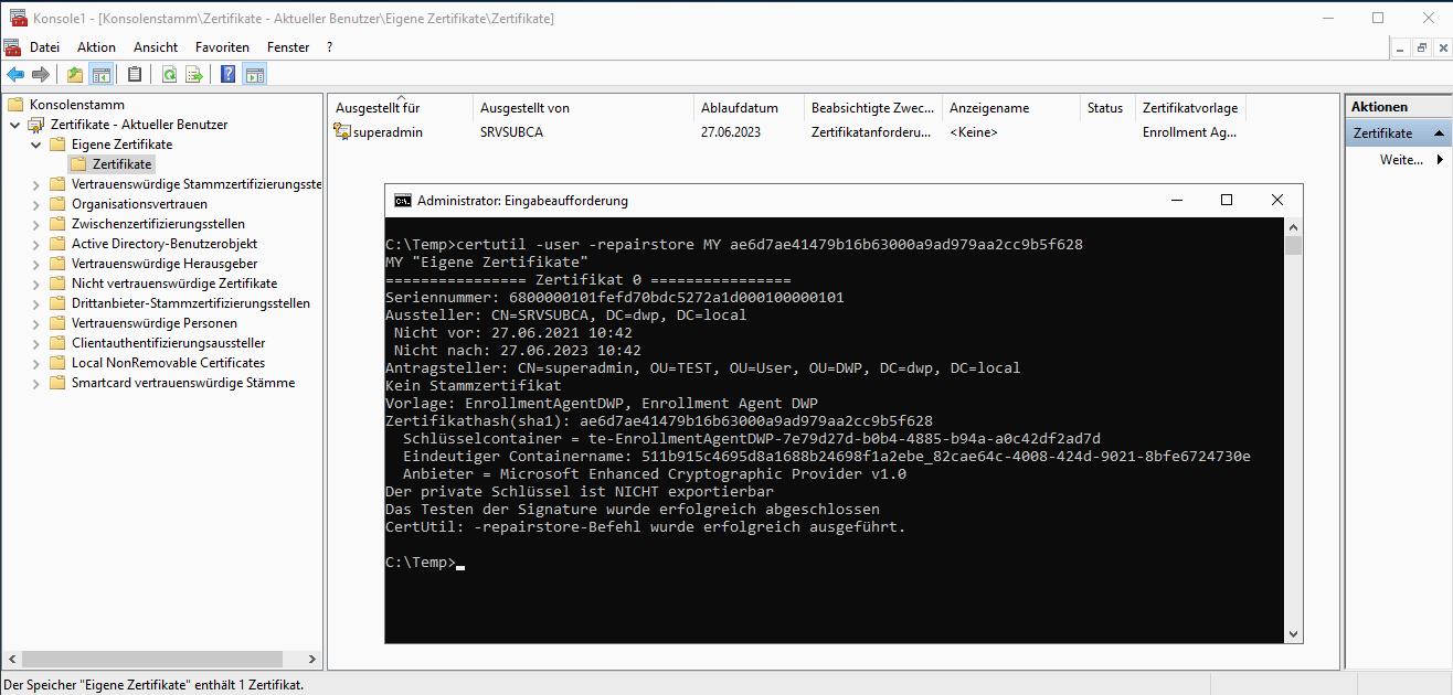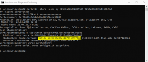 Und dazu reparieren wir den Zertifikatsspeicher und setzten diesen Befehl ab. Für die Reparatur benötigten wir lediglich den Fingerabdruck (Thumbprint) des Zertifikat.