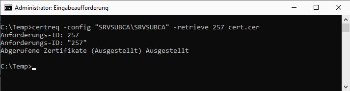 certreq -config “SRVSUBCA\SRVSUBCA” -retrieve 257 cert.cer