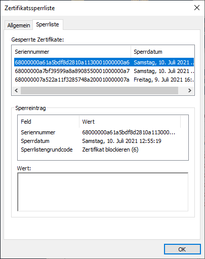 Das Zertifikat wird dann entsprechend in die Sperrliste aufgenommen und ist somit ungültig.