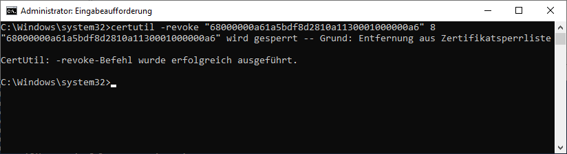 Zum Sperren von Zertifikaten öffnen wir die Kommandozeile mit administrativen Rechten und setzen folgenden Befehl ab. Die Seriennummer steht in Klammern und die Zahl am Ende des Befehls steht für den Sperrgrund.